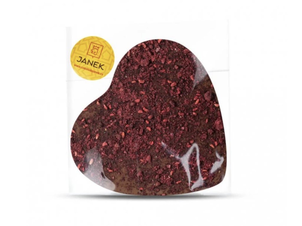 Velké čokoládové srdce z výrazné mléčnéé čokolády provoněné zrníčky pravé vanilky a k tomu lyofilizované maliny a lahodné ostružiny.
