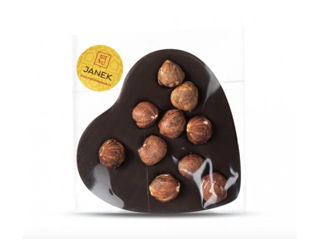 Velké čokoládové srdce z výrazné hořké čokolády provoněné zrníčky pravé vanilky a k tomu křupavé lískové oříšky.