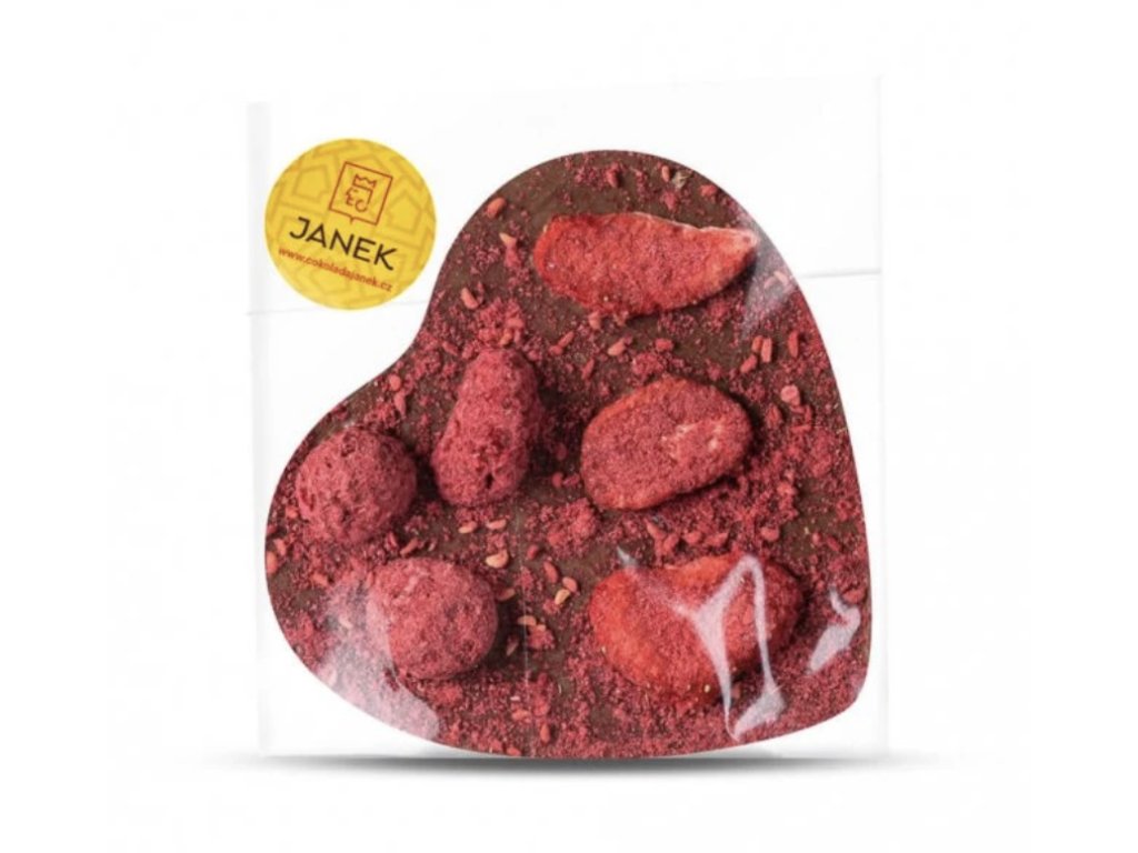 Velké čokoládové srdce z lahodné mléčné čokolády provoněné zrníčky pravé vanilky a k tomu lyofilizované maliny a jahody.