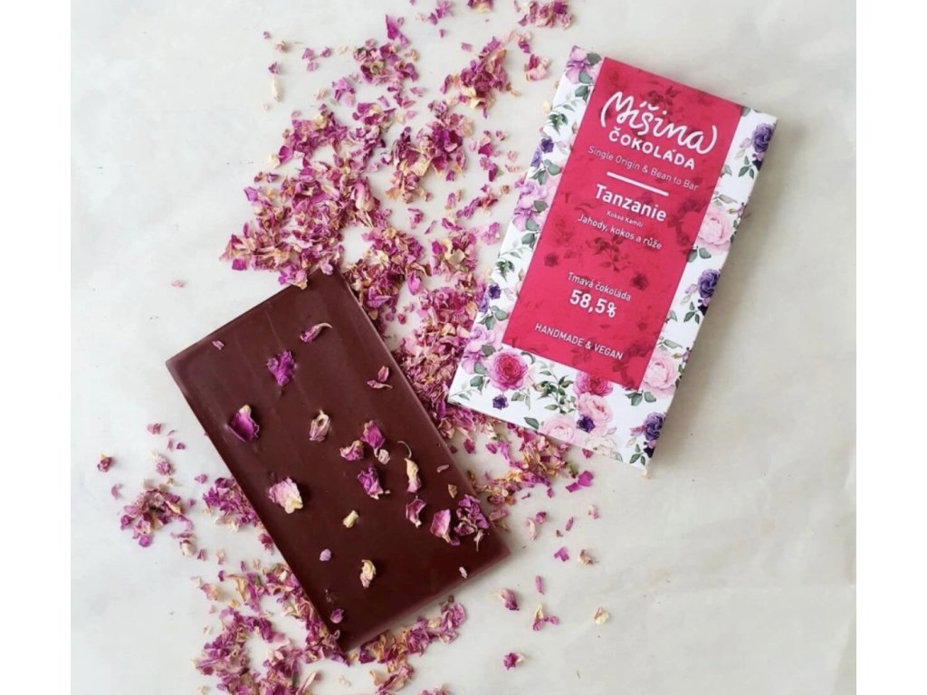 Ke kakaovým bobům přidali v Míšině čokoládě jahody a kokos a vznikla tak jemná čokoláda, která voní a chutná po jahodách a kokosu. Její posyp tvoří květy těch nejvoňavějších damašských růží.