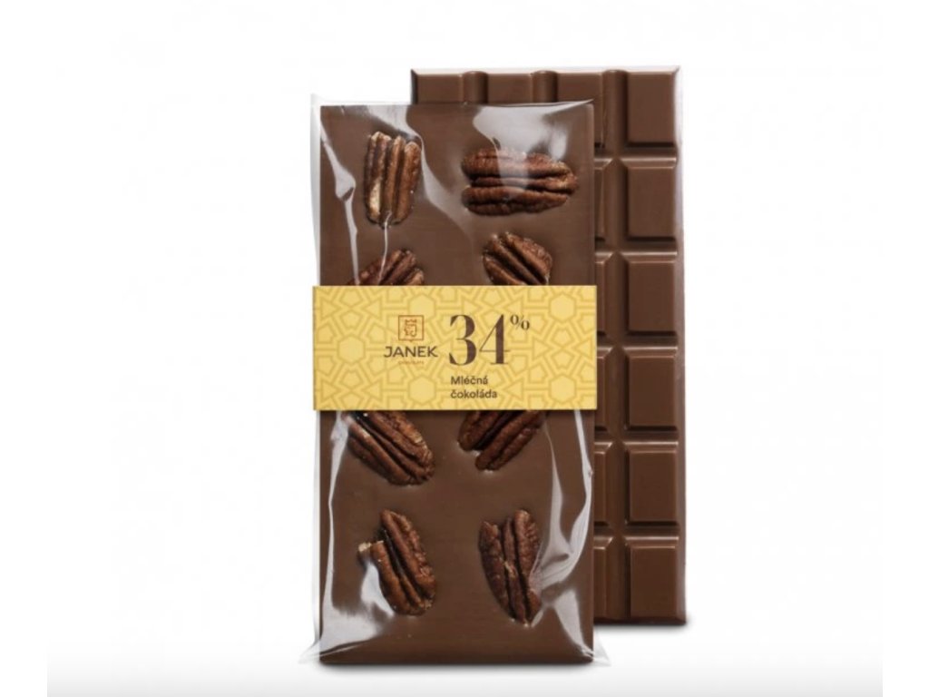 Jemná 34% čokoláda s pekanovými ořechy - to je kousek, který voní, křupe a zároveň se pomalu rozplývá na jazyku.