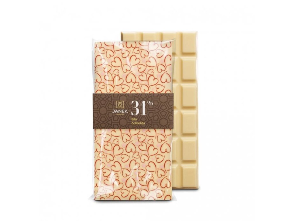 Čokoládová láska v podobě jemné bílé čokolády poseté srdíčky - skvělý tip na valentýnský dárek.