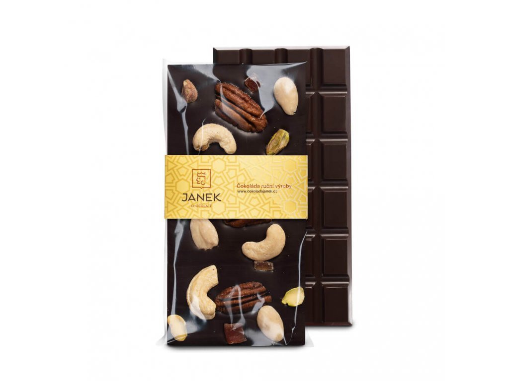 Výrazná hořká čokoláda provoněná vanilkou. Žádnými aromaty nebo esencemi. Ale zrníčky pravé vanilky. K tomu přidejte ručně přebrané pekanové a kešu ořechy, pistácie, kousky sušené papayi a máte tabulku, která voní, křupe a zároveň se pomalu rozplývá na jazyku.