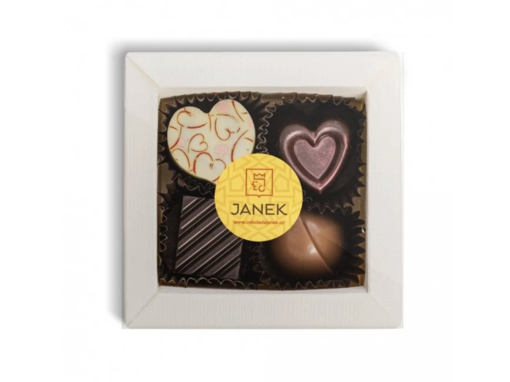 Udělejte radost krabičkou se čtyřmi lahodnými čokoládovými pralinkami z čokoládovny Janek.