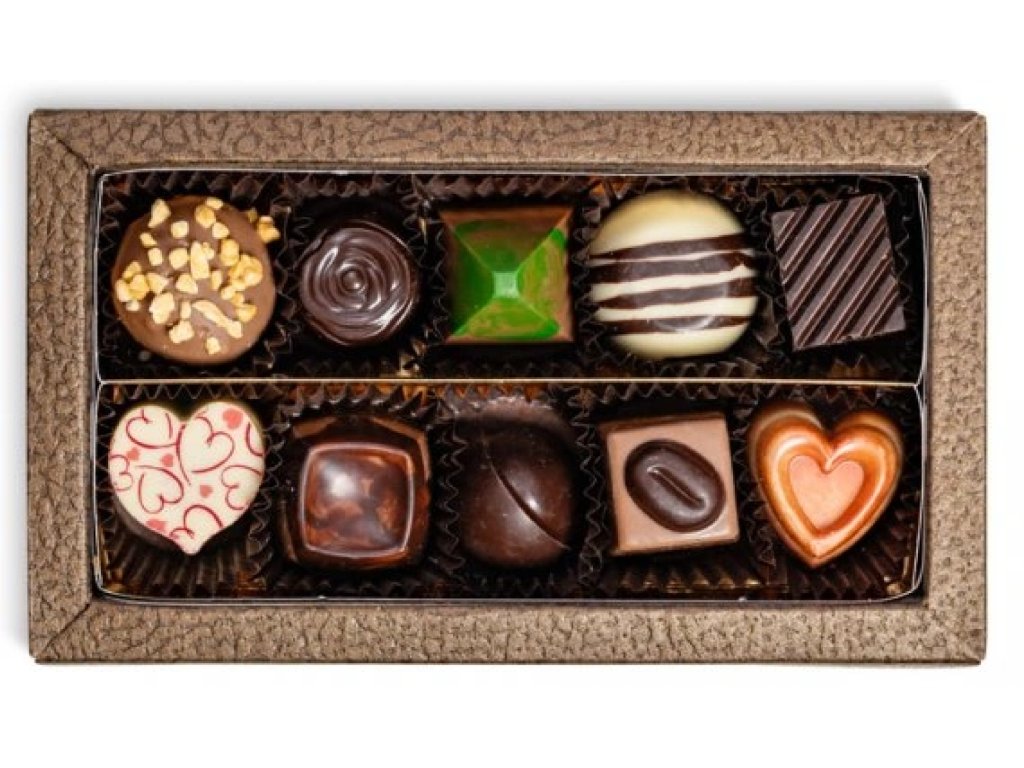 Složení: Pralinky 10 kusů (irská káva, levandule, lískový ořech, slaný karamel, jablečný karamel, jahoda, malina, lísko-oříškový nugát, karamel, med a skořice)