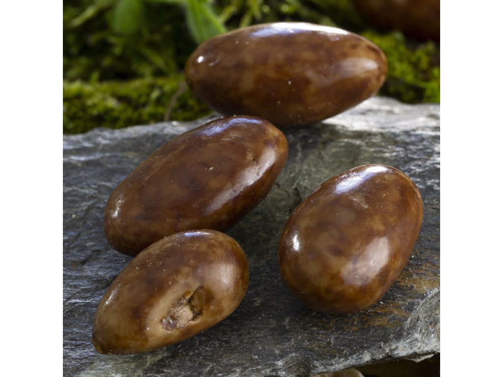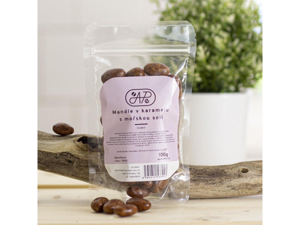 Složení: karamelová poleva 69% (cukr, kakaové máslo, sušené plnotučné mléko 3%, karamelový prášek (cukr, sušené mléko), sušené mléko, kakaová hmota, slunečnicový lecitin, přírodní aroma, sůl, extrakt koření), mandle 27%, hořká čokoláda 1% (kakaová hmota, cukr, kakaové máslo, mléčný tuk, sojový lecitin, přírodní vanilkové aroma), mořská sůl 0,6%, modifikovaný tapiokový škrob, glukózový sirup, kokosový olej, arabská guma, slunečnicový lecitin, leštící činidlo šelak, kyselina citronová, konzervant E200