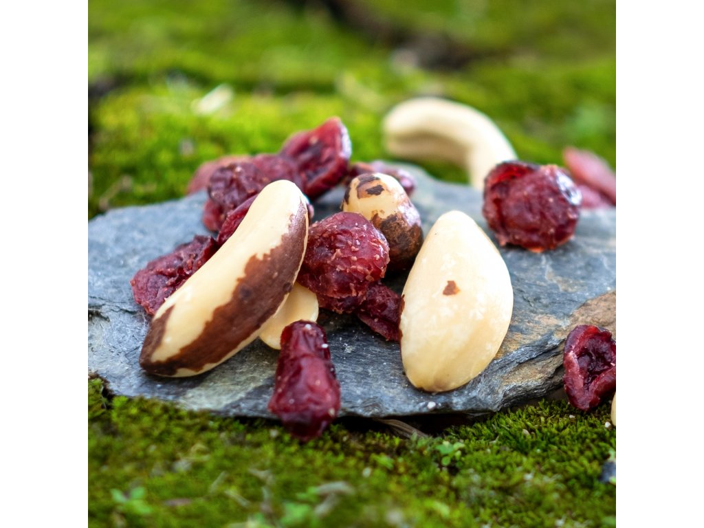 Složení: Klikva velkoplodá 60%, cukr, slunečnicový olej, arašídy pražené loupané, jádra para ořechů, jádra mandlí, jádra lískových ořechů, jádra kešu ořechů