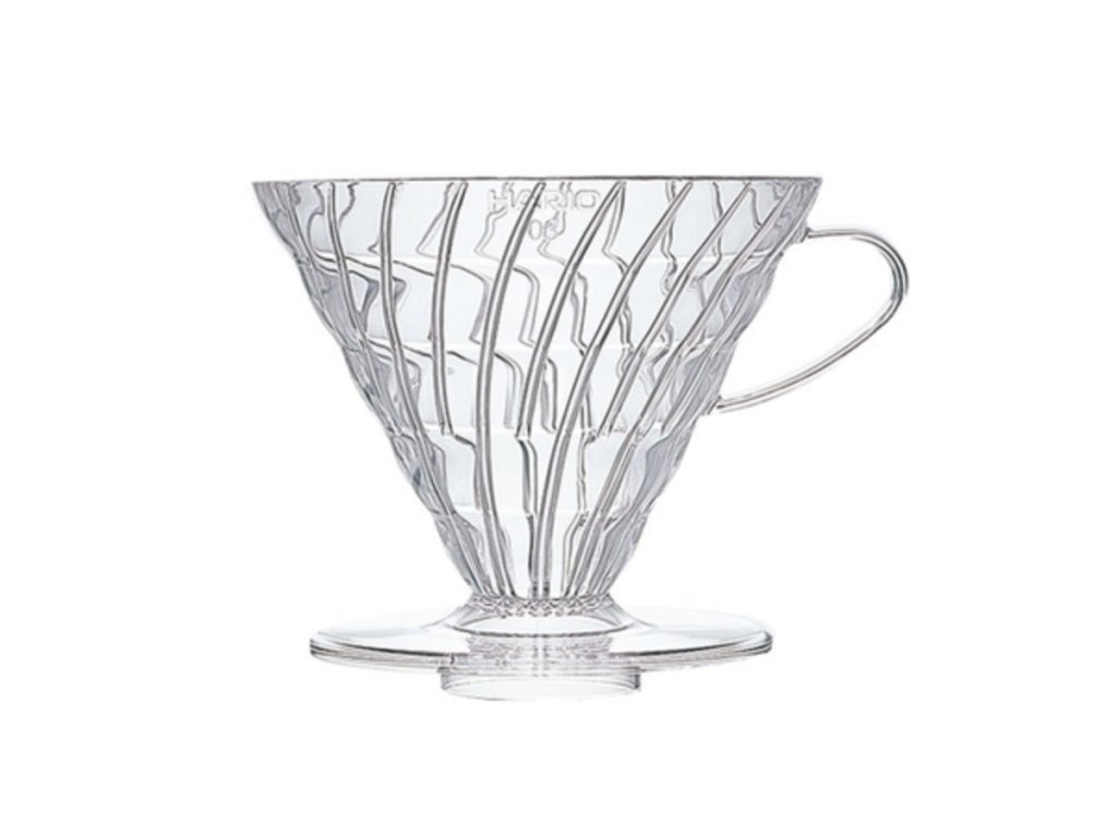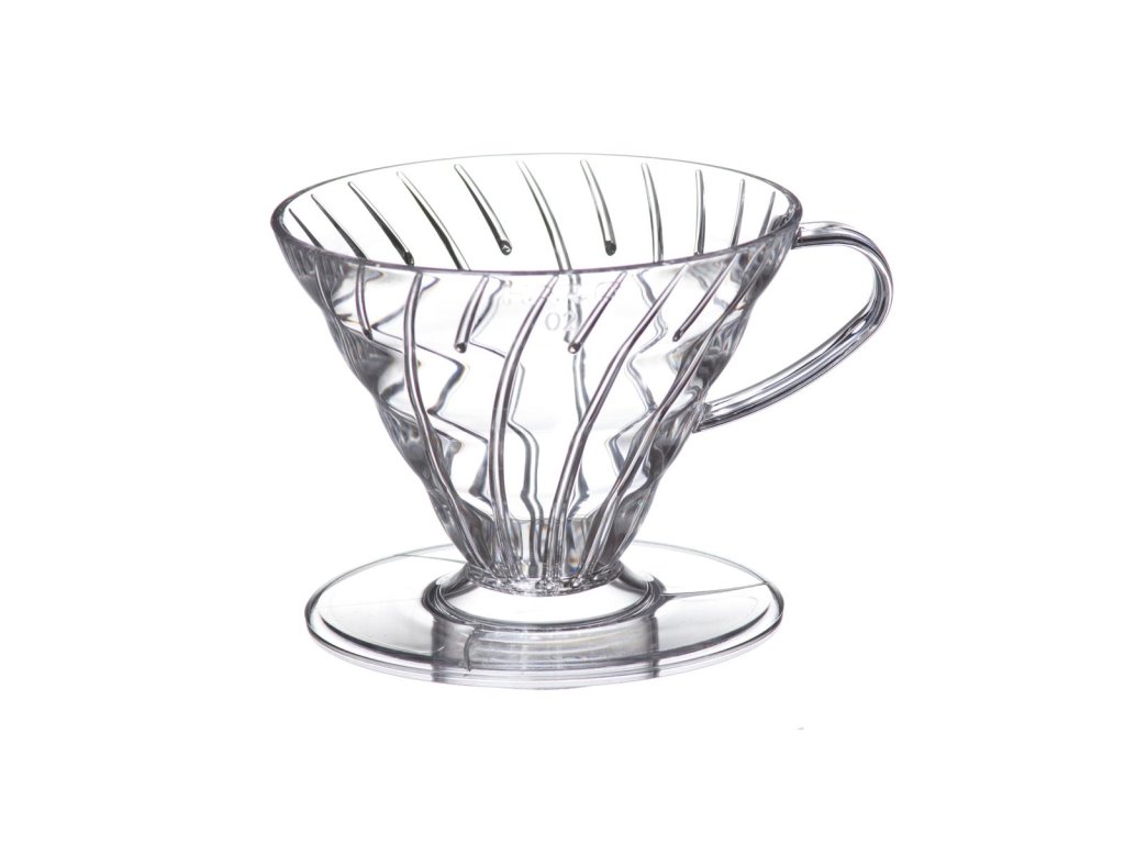 Dripper Hario V60-03 je vyroben z průhledného plastu, který usnadňuje údržbu a zaručuje minimální možnost poškození